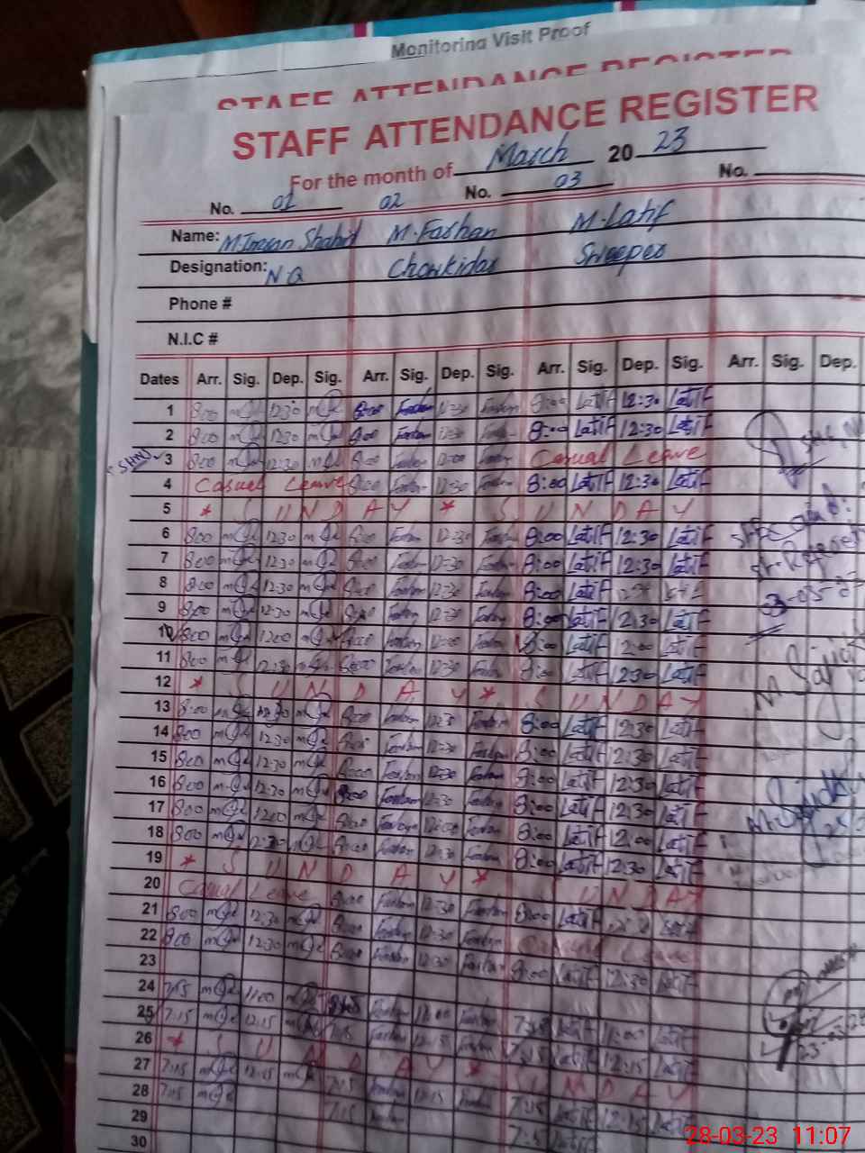 | CNIC | Full Name | Designation | R/C | Absence During Last Calender Month |
