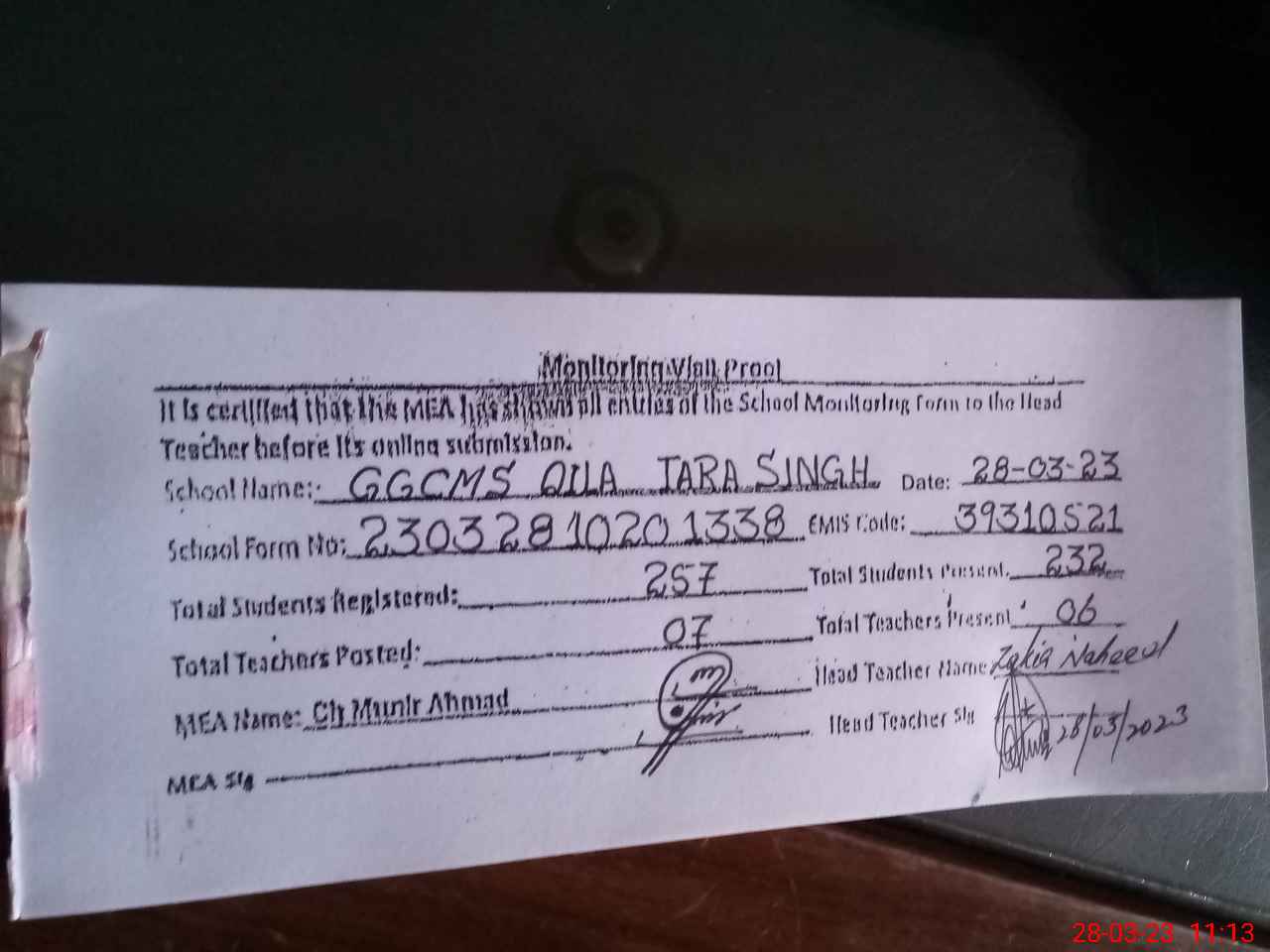 | Attendance Register | Head Teacher | MEA with School | Visit Proof |