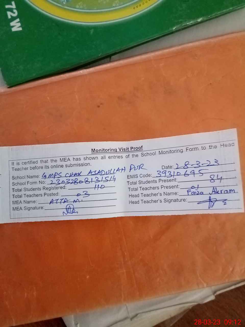 | Attendance Register | Head Teacher | MEA with School | Visit Proof |