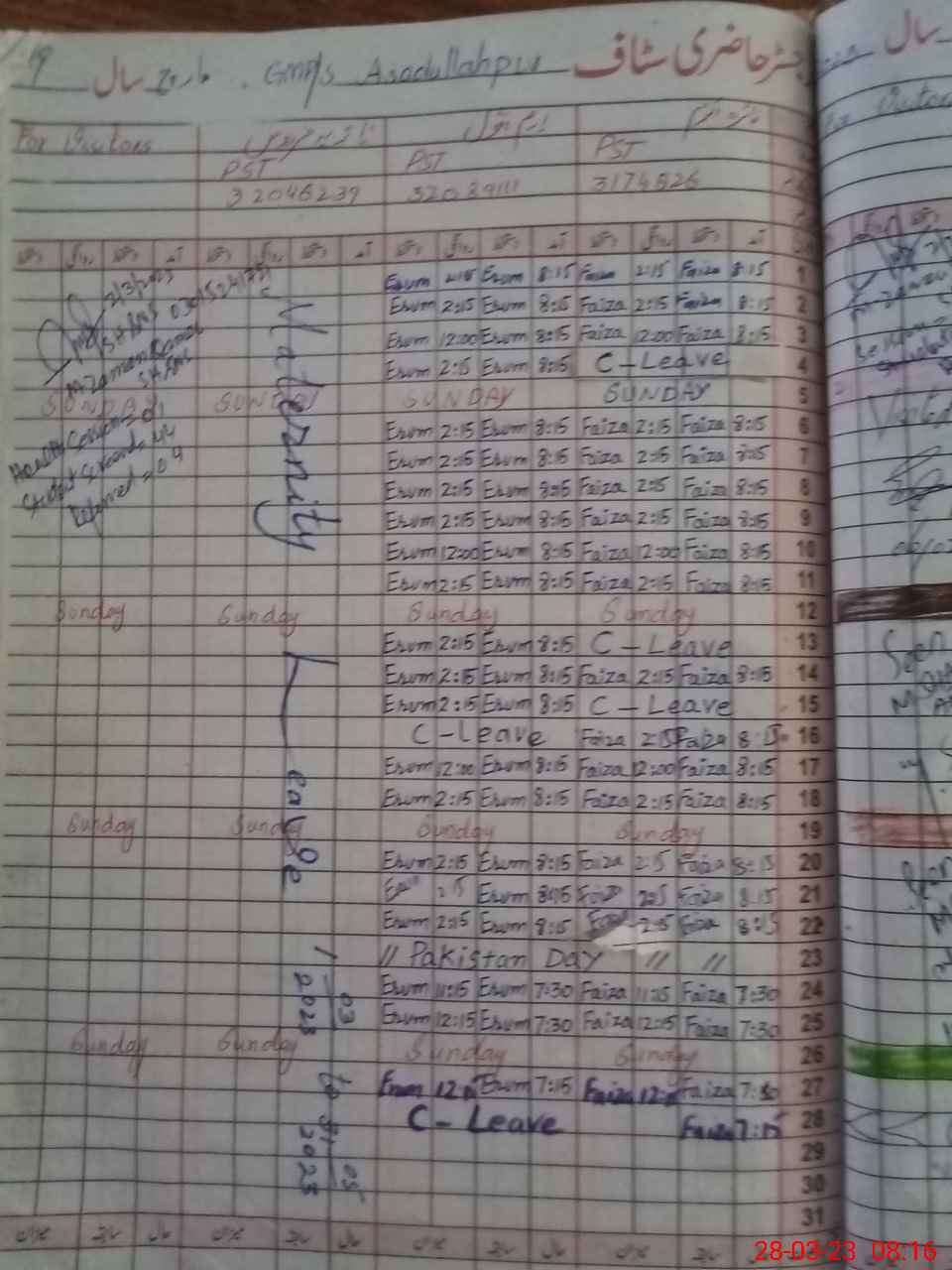 | Leave | Duty | Absent | Maternity | Medical | Ex- Pak |