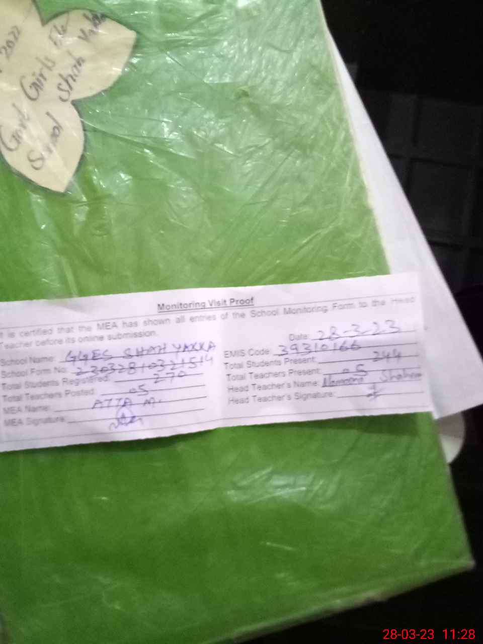 | Attendance Register | Head Teacher | MEA with School | Visit Proof |