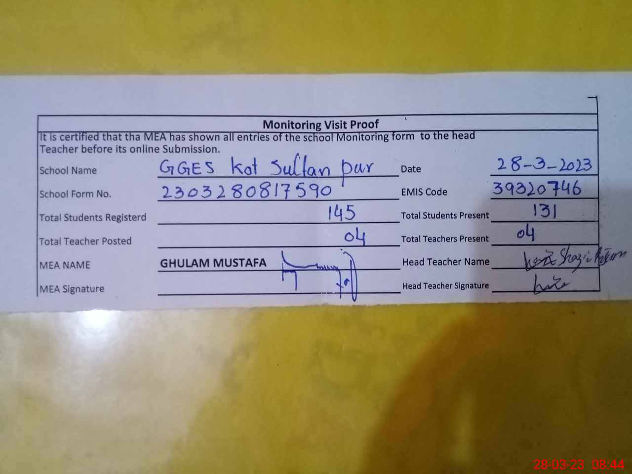 | Attendance Register | Head Teacher | MEA with School | Visit Proof |