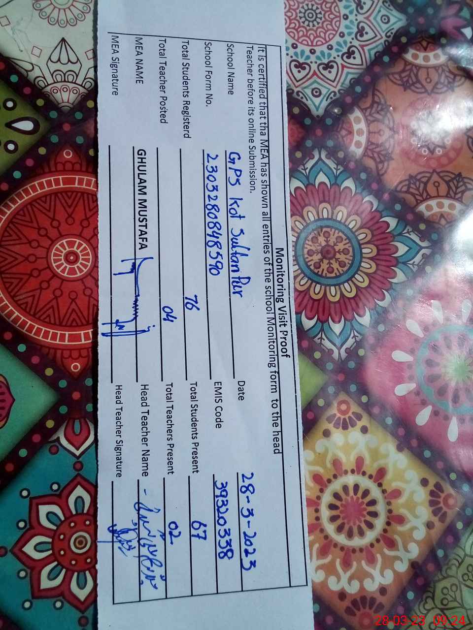 | EMIS Code: 39320338 | Name of School: GPS KOT SULTAN PUR | |||