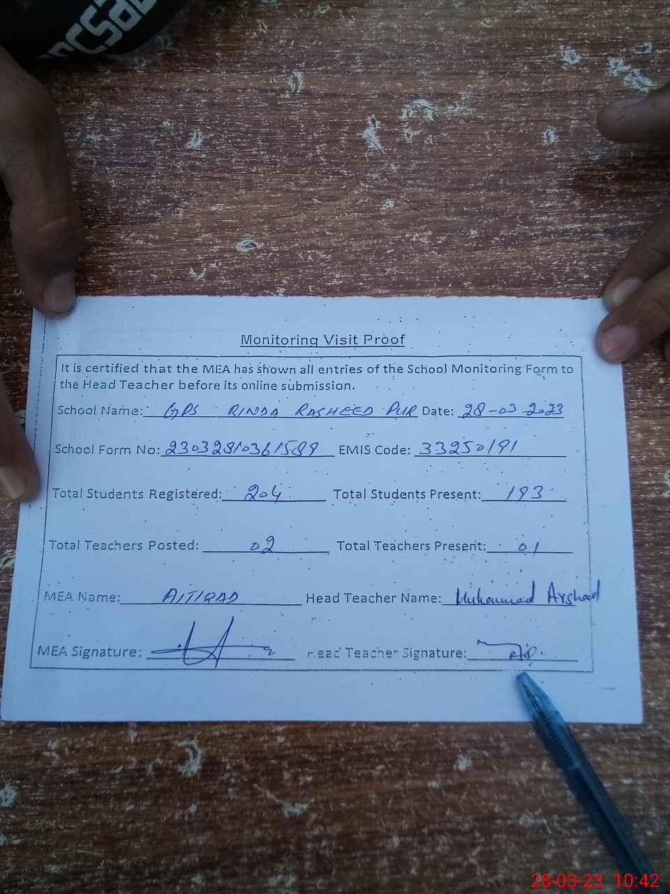 | Attendance Register | Head Teacher | MEA with School | Visit Proof |