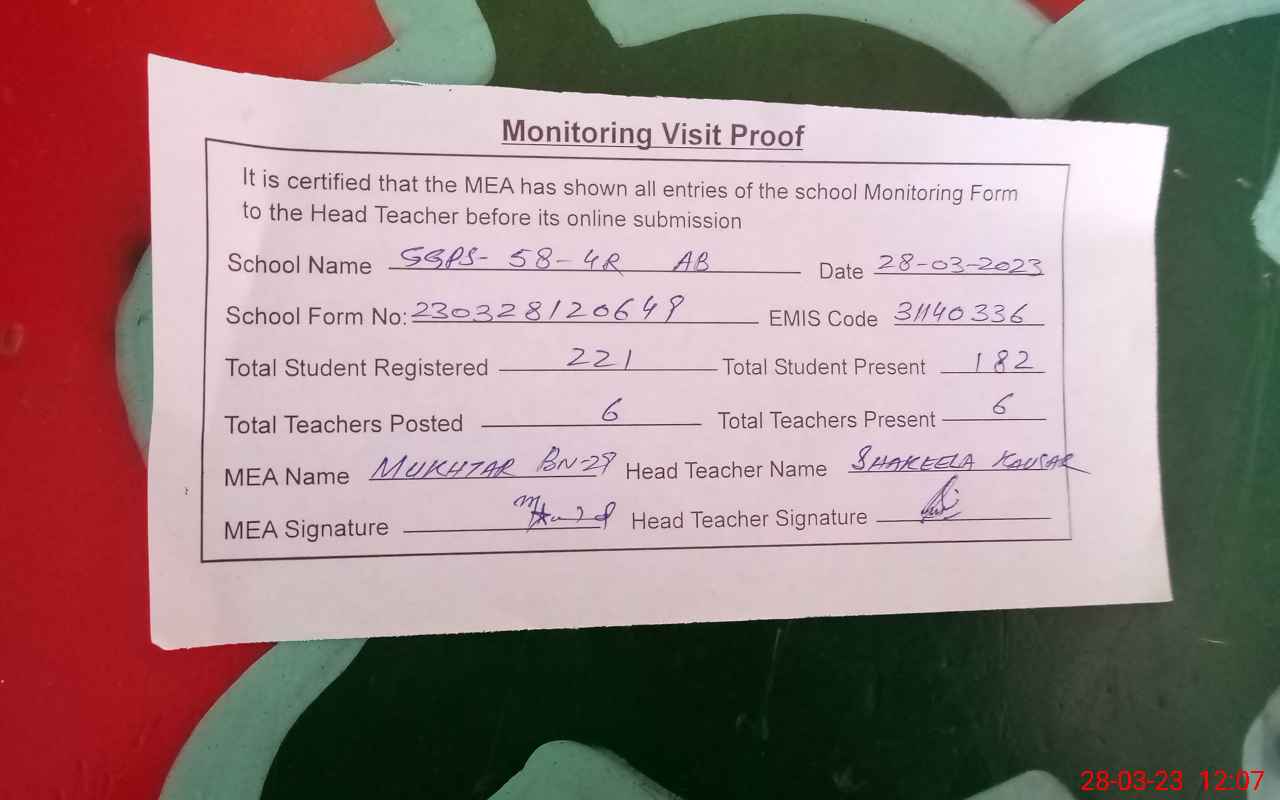 | Attendance Register | Head Teacher | MEA with School | Visit Proof |