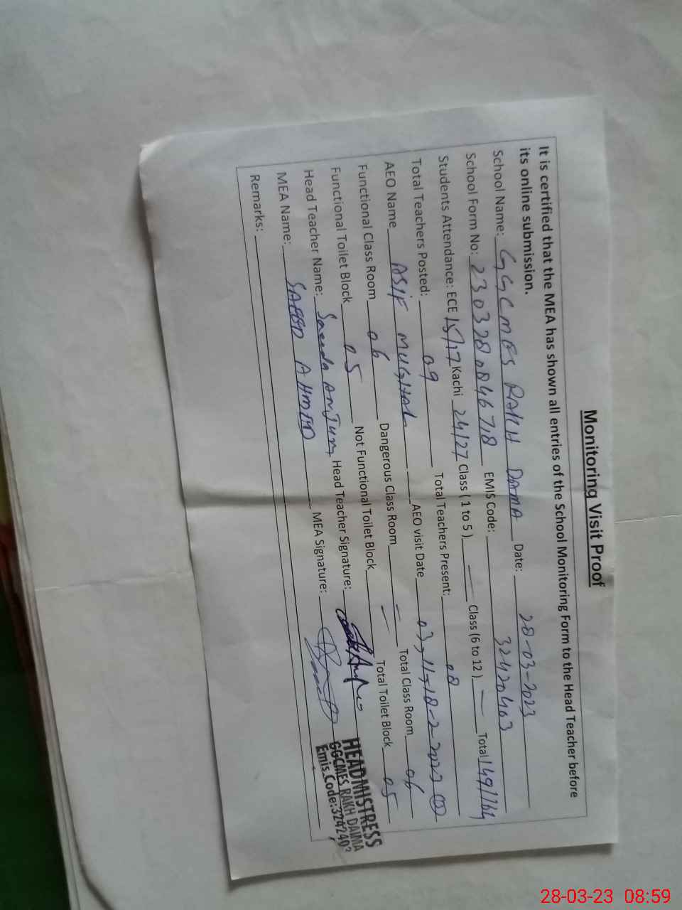 | Attendance Register | Head Teacher | MEA with School | Visit Proof |