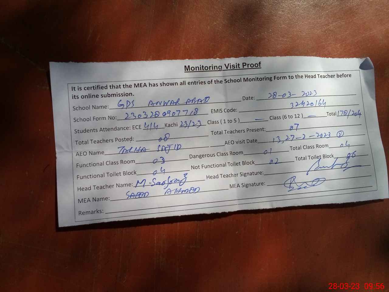 | Attendance Register | Head Teacher | MEA with School | Visit Proof |