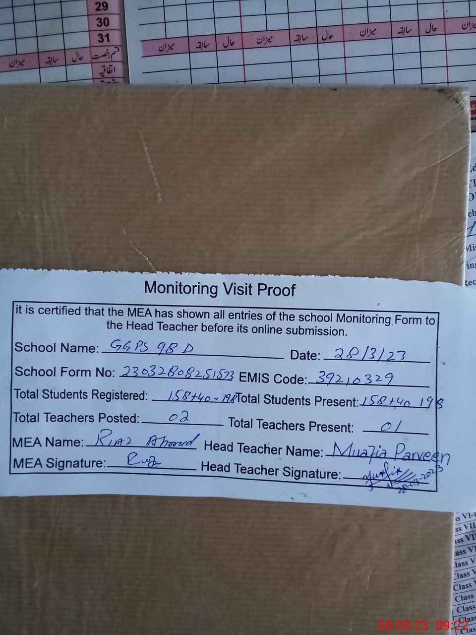 | Attendance Register | Head Teacher | MEA with School | Visit Proof |