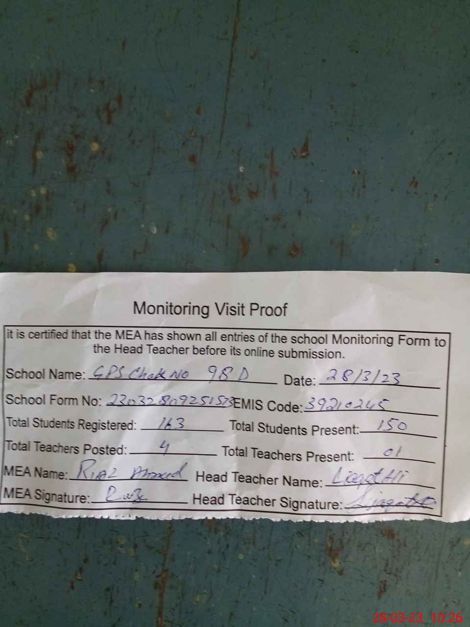 | Attendance Register | Head Teacher | MEA with School | Visit Proof |