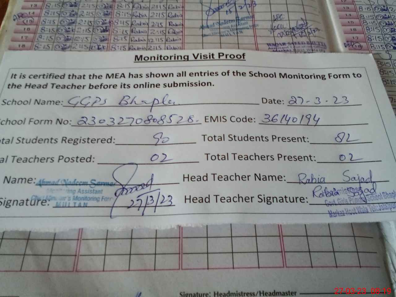 | Attendance Register | Head Teacher | MEA with School | Visit Proof |