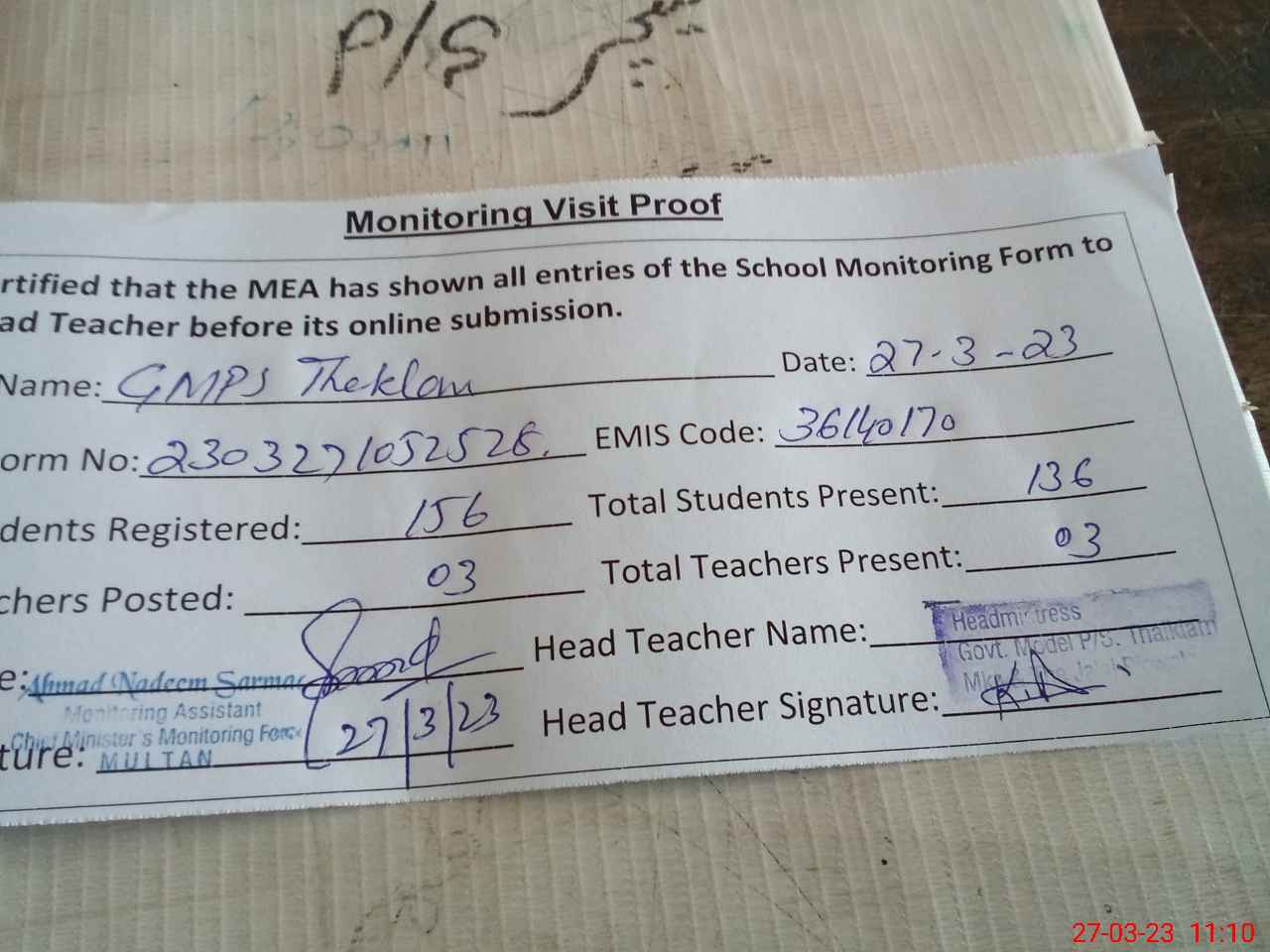 | Attendance Register | Head Teacher | MEA with School | Visit Proof |