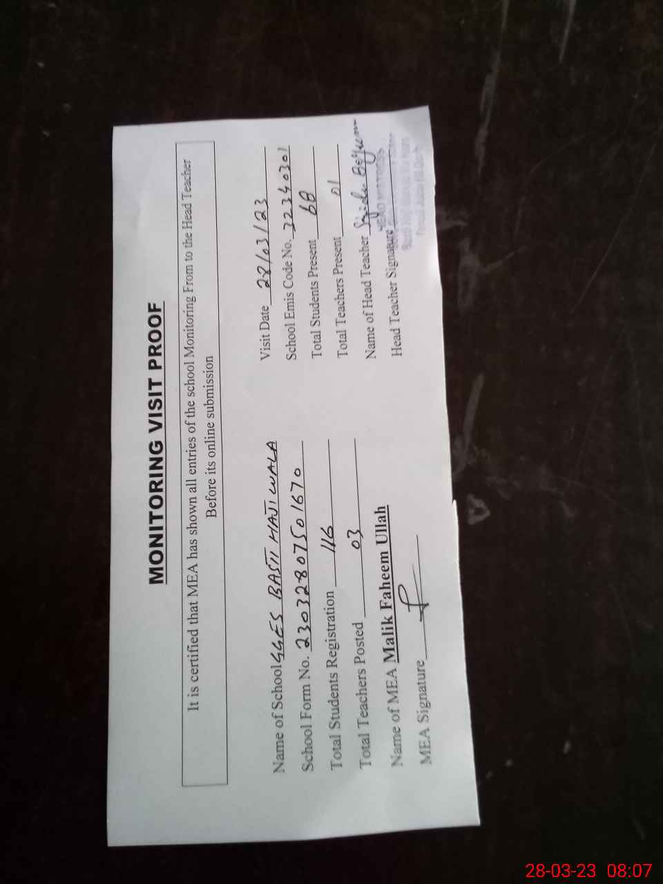 | Attendance Register | Head Teacher | MEA with School | Visit Proof |