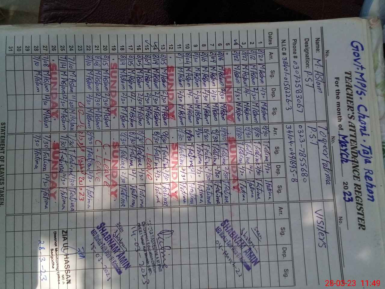 | Name: Mu**** As**** Designation: (School Headmaster's/Headmistress's) P S T Phone/Cell Number: 03**** |