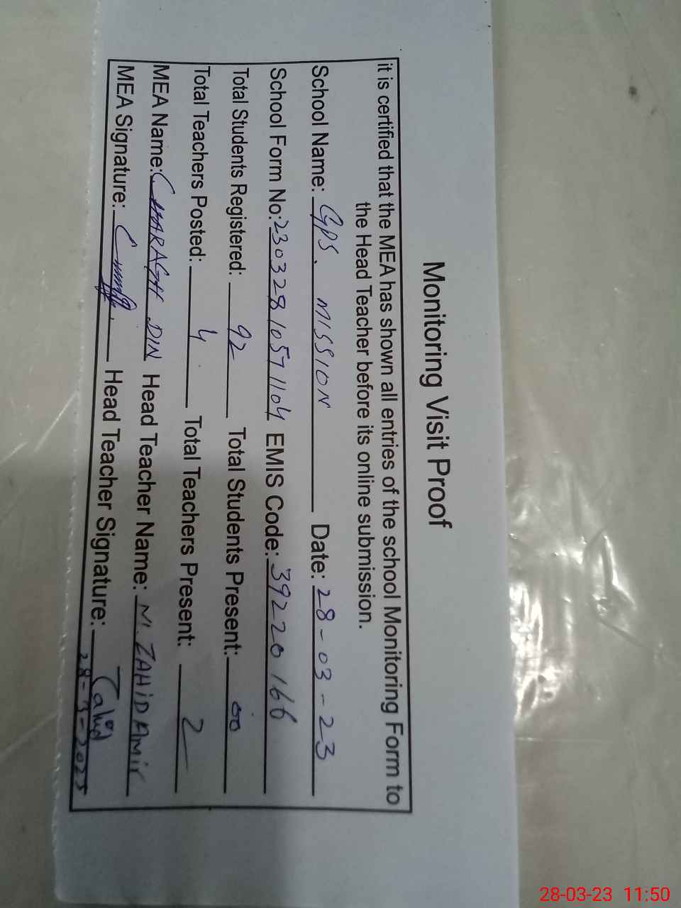 | Attendance Register | Head Teacher | MEA with School | Visit Proof |
