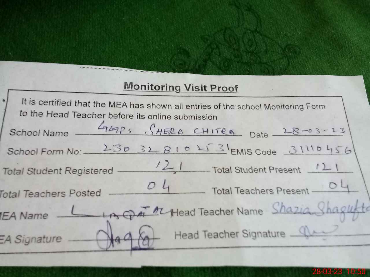 | Attendance Register | Head Teacher | MEA with School | Visit Proof |