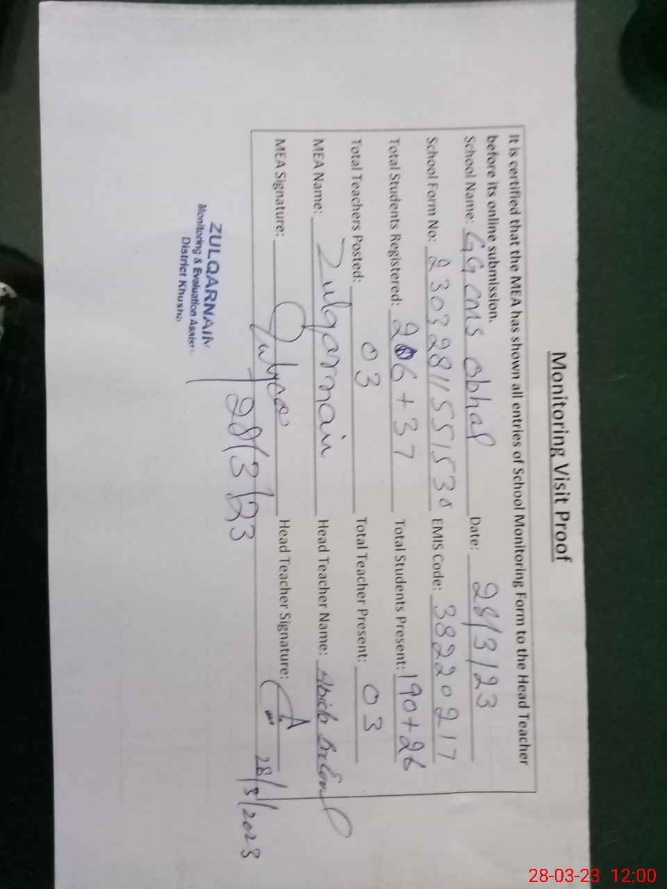 | Attendance Register | Head Teacher | MEA with School | Visit Proof |