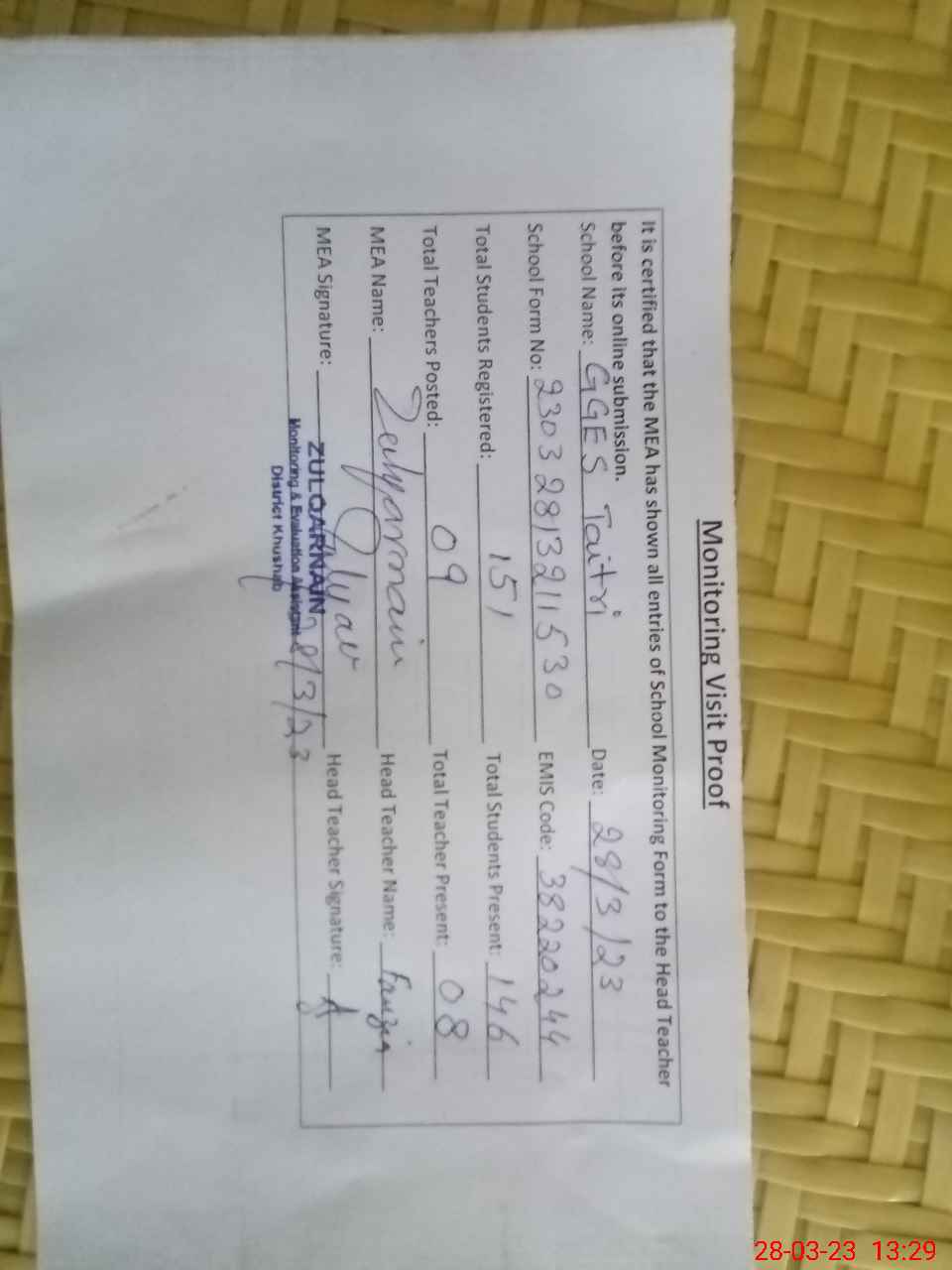 | Attendance Register | Head Teacher | MEA with School | Visit Proof |