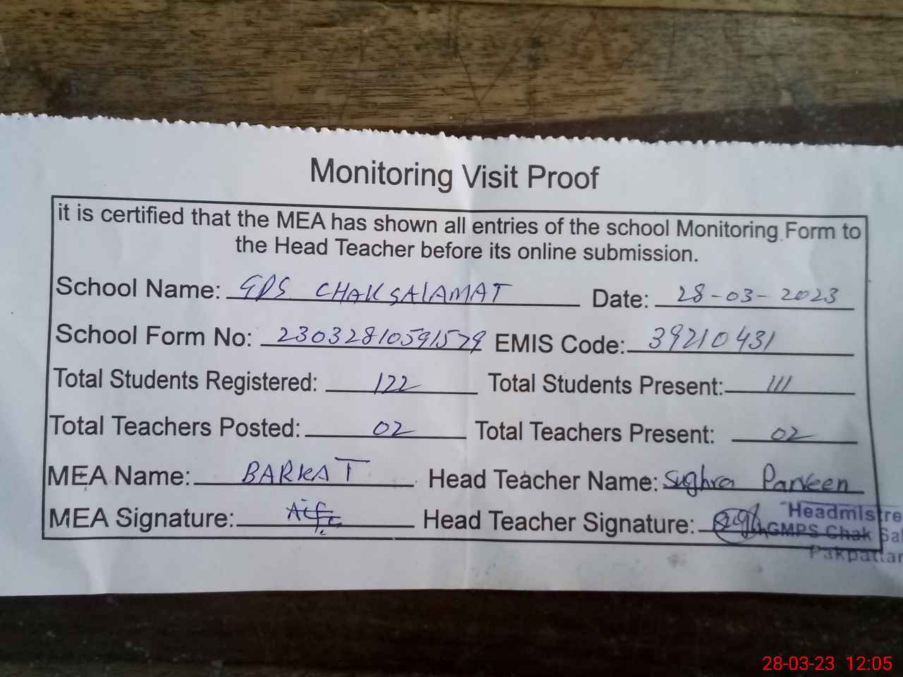 | Attendance Register | Head Teacher | MEA with School | Visit Proof |