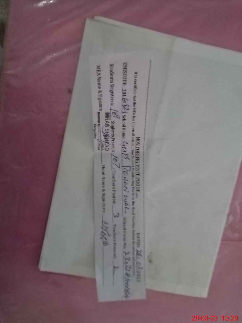 | Attendance Register | Head Teacher | MEA with School | Visit Proof |