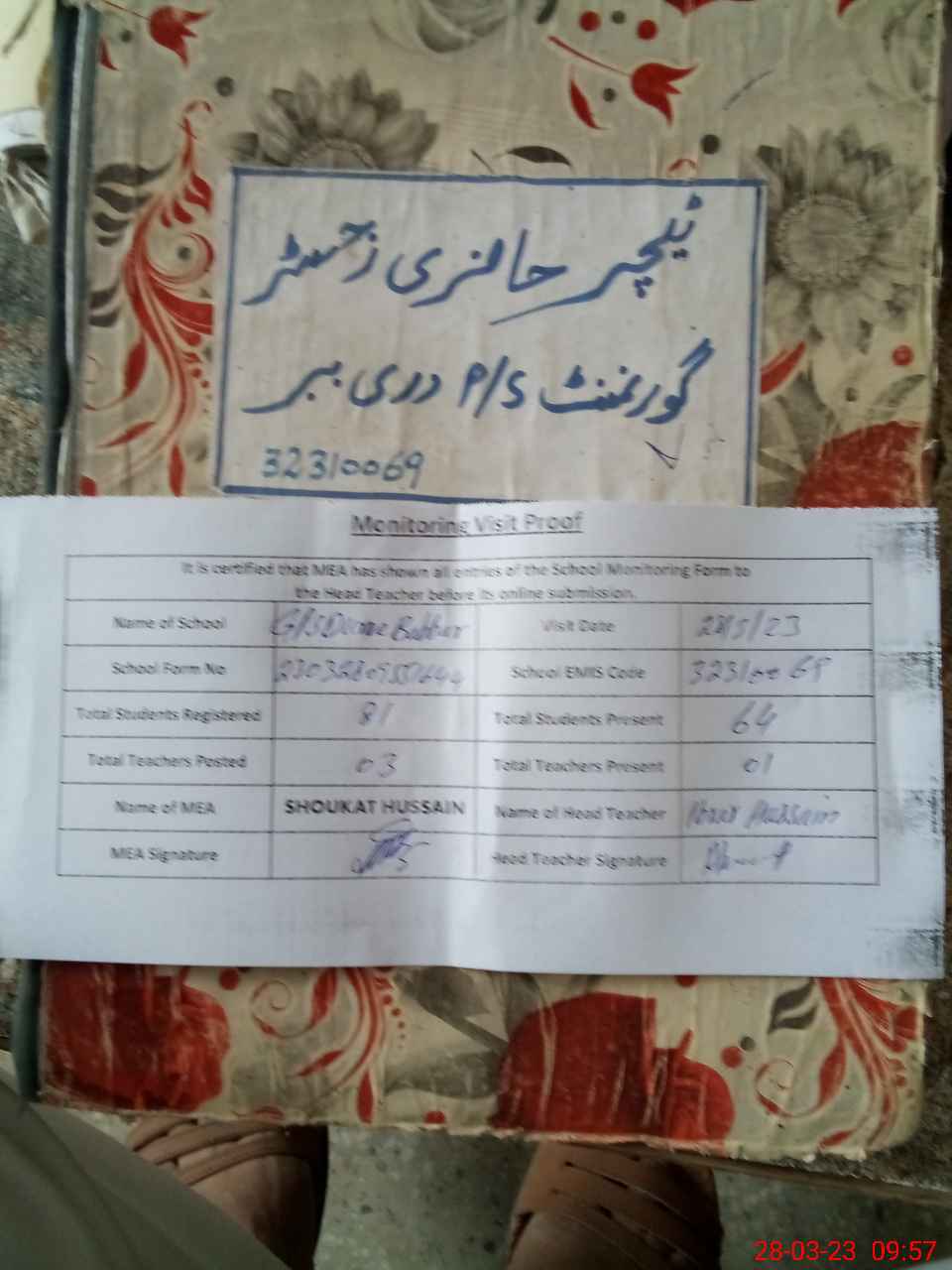 | Attendance Register | Head Teacher | MEA with School | Visit Proof |