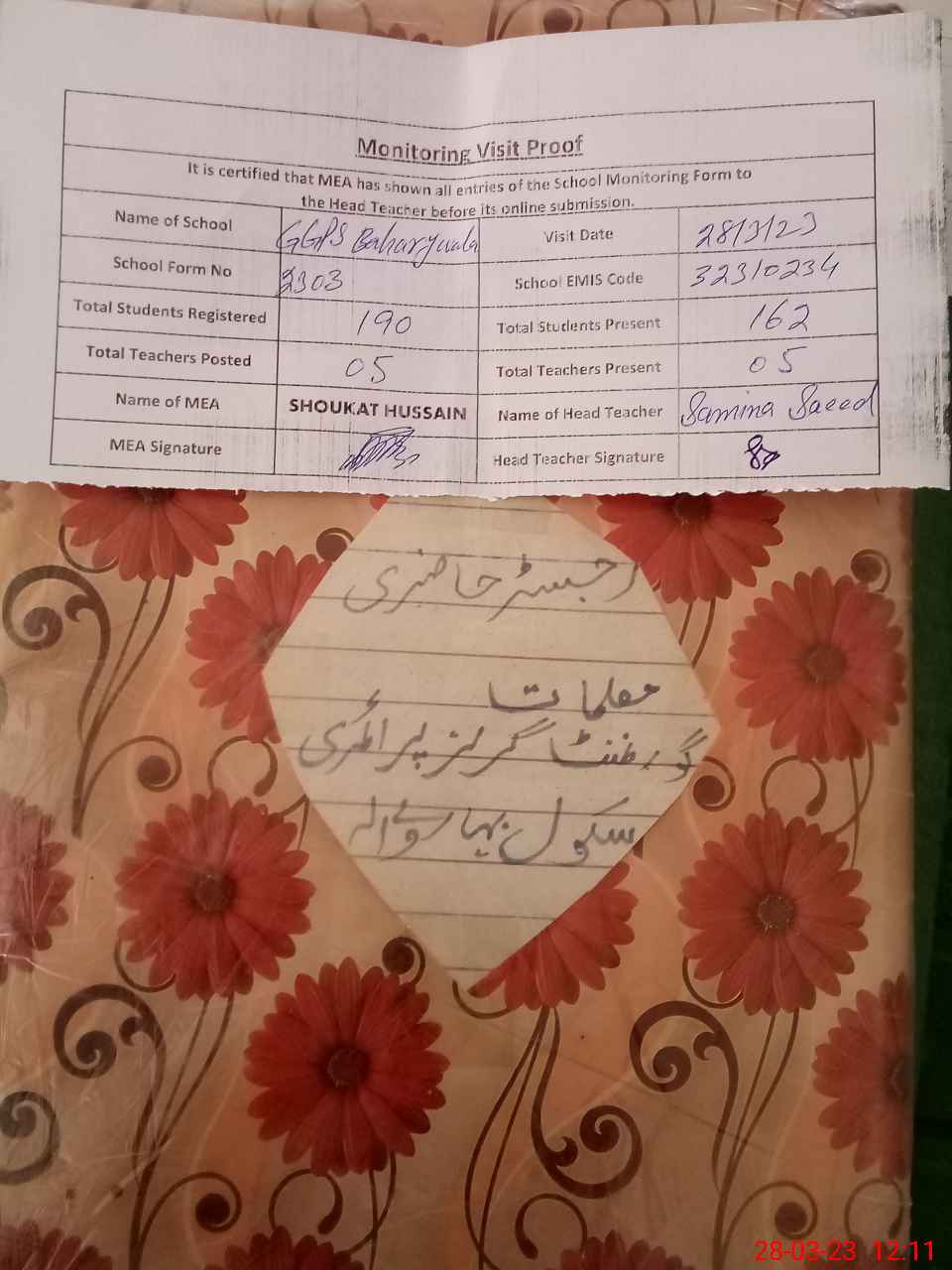 | EMIS Code: 32310234 | Name of School: GGPS BAHARAY WALA | |||