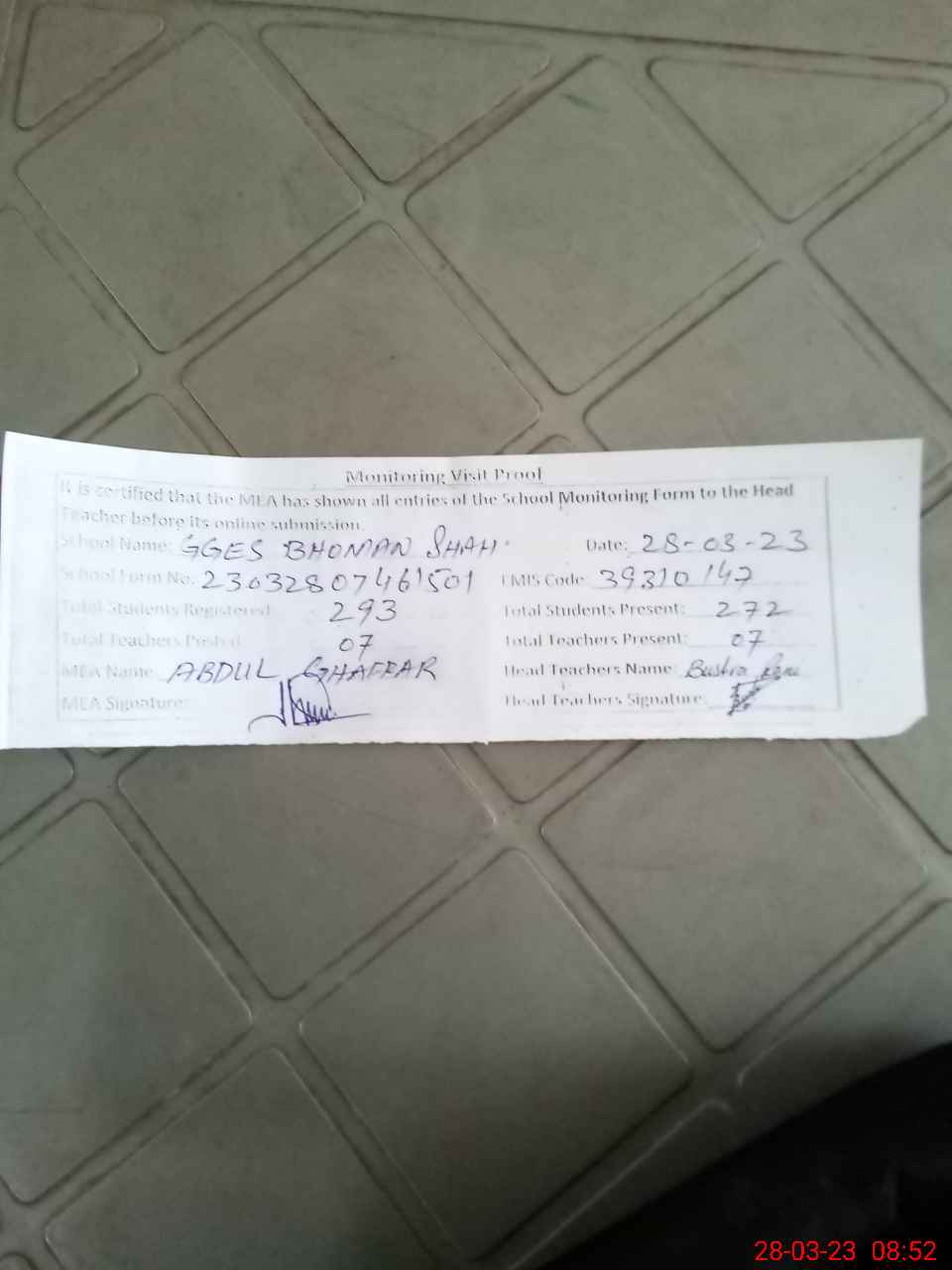 | Attendance Register | Head Teacher | MEA with School | Visit Proof |