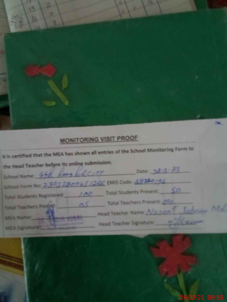 | Attendance Register | Head Teacher | MEA with School | Visit Proof |