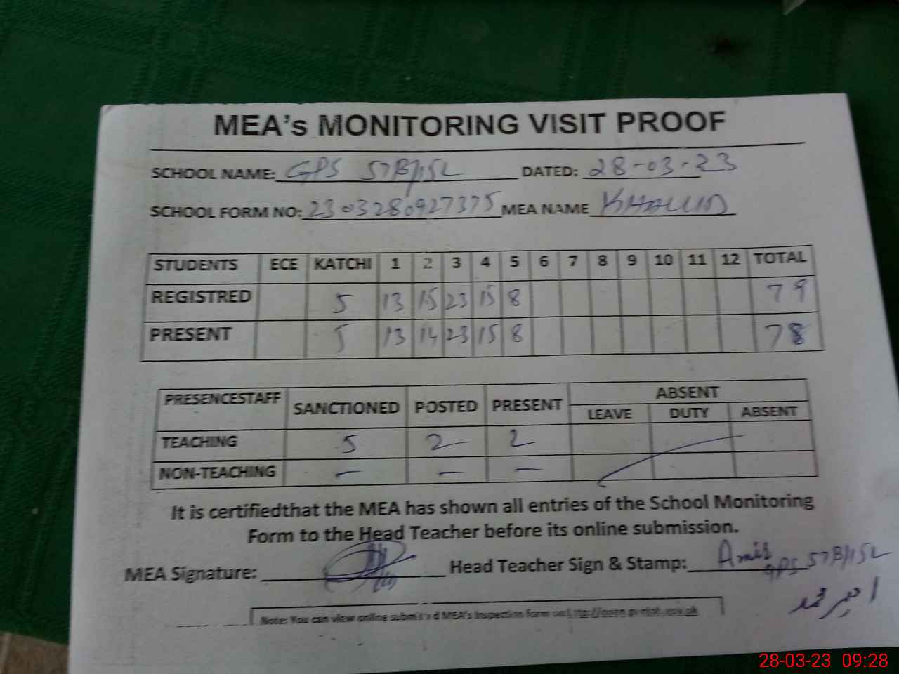 | Attendance Register | Head Teacher | MEA with School | Visit Proof |