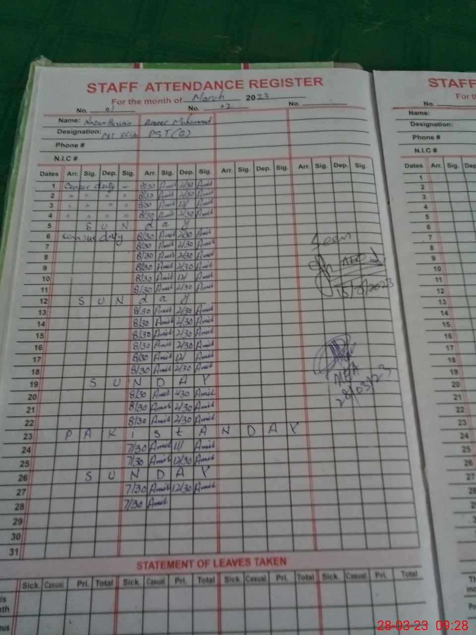 | CNIC | Full Name | Designation | R/C | Absence During Last Calender Month |