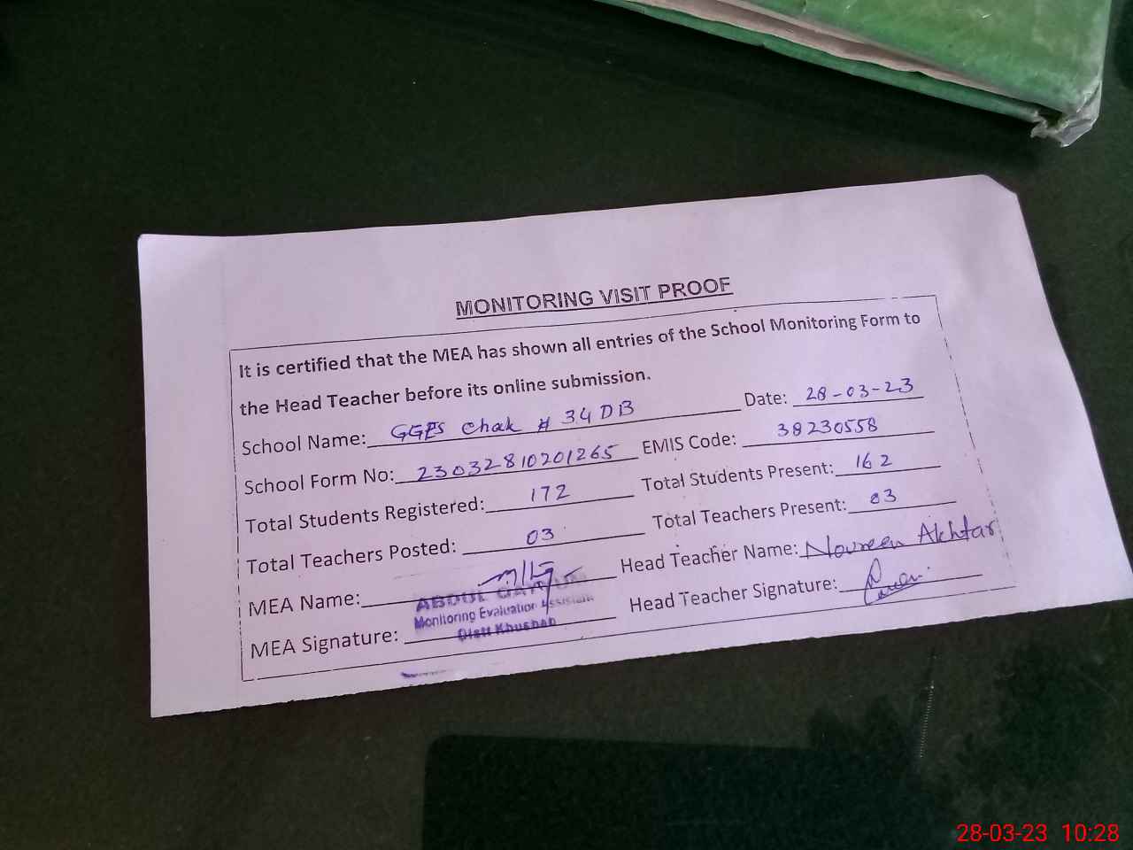 | Attendance Register | Head Teacher | MEA with School | Visit Proof |