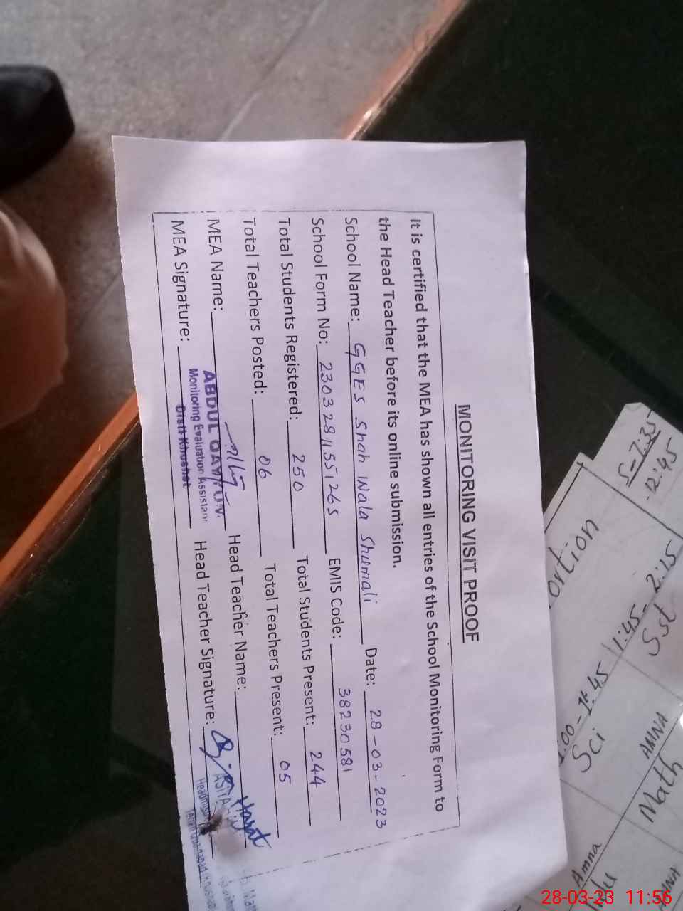 | Attendance Register | Head Teacher | MEA with School | Visit Proof |