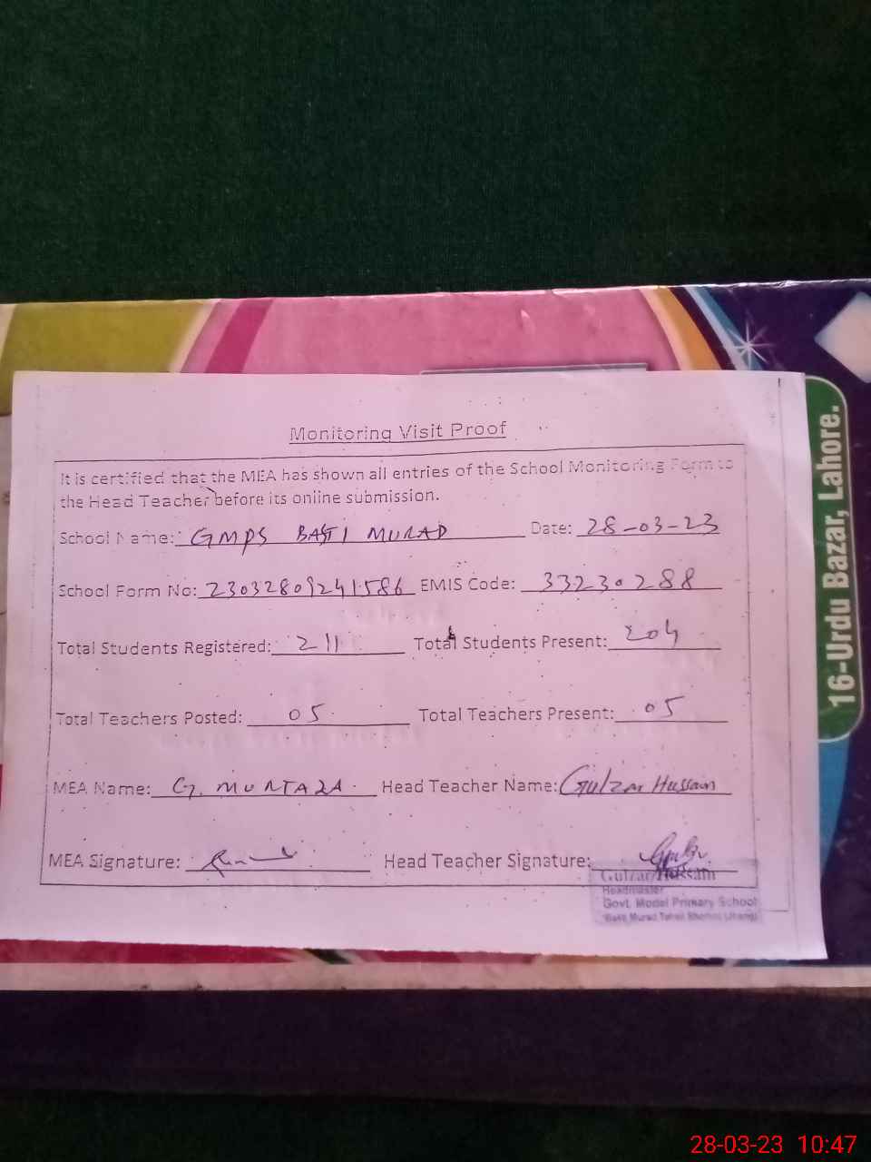 | EMIS Code: 33230288 | Name of School: GMPS BASTI MURAD | |||