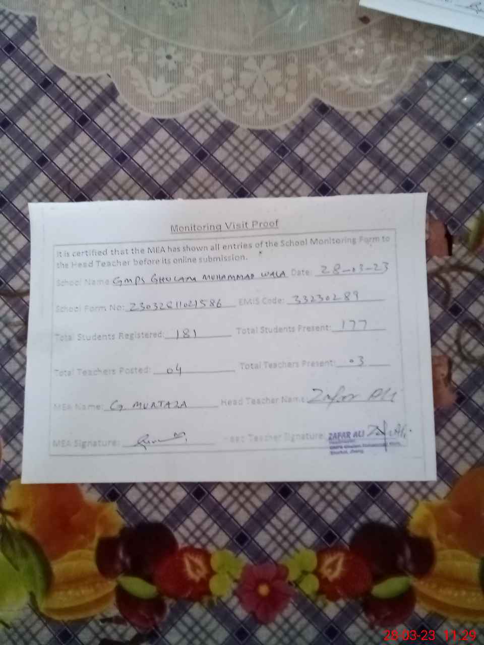 | EMIS Code: 33230289 | Name of School: GMPS GHULAM MUHAMMAD WALA | |||