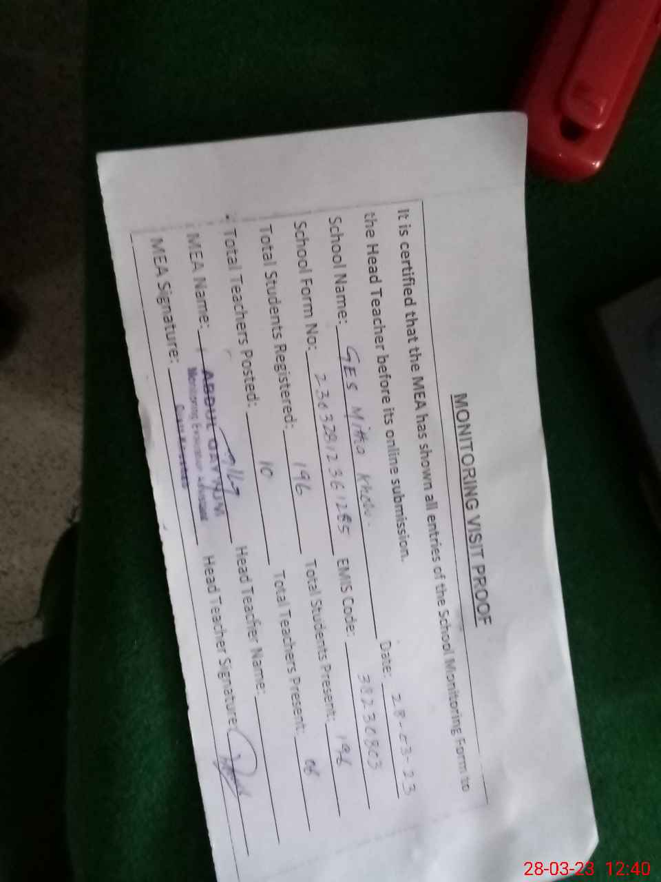 | Attendance Register | Head Teacher | MEA with School | Visit Proof |