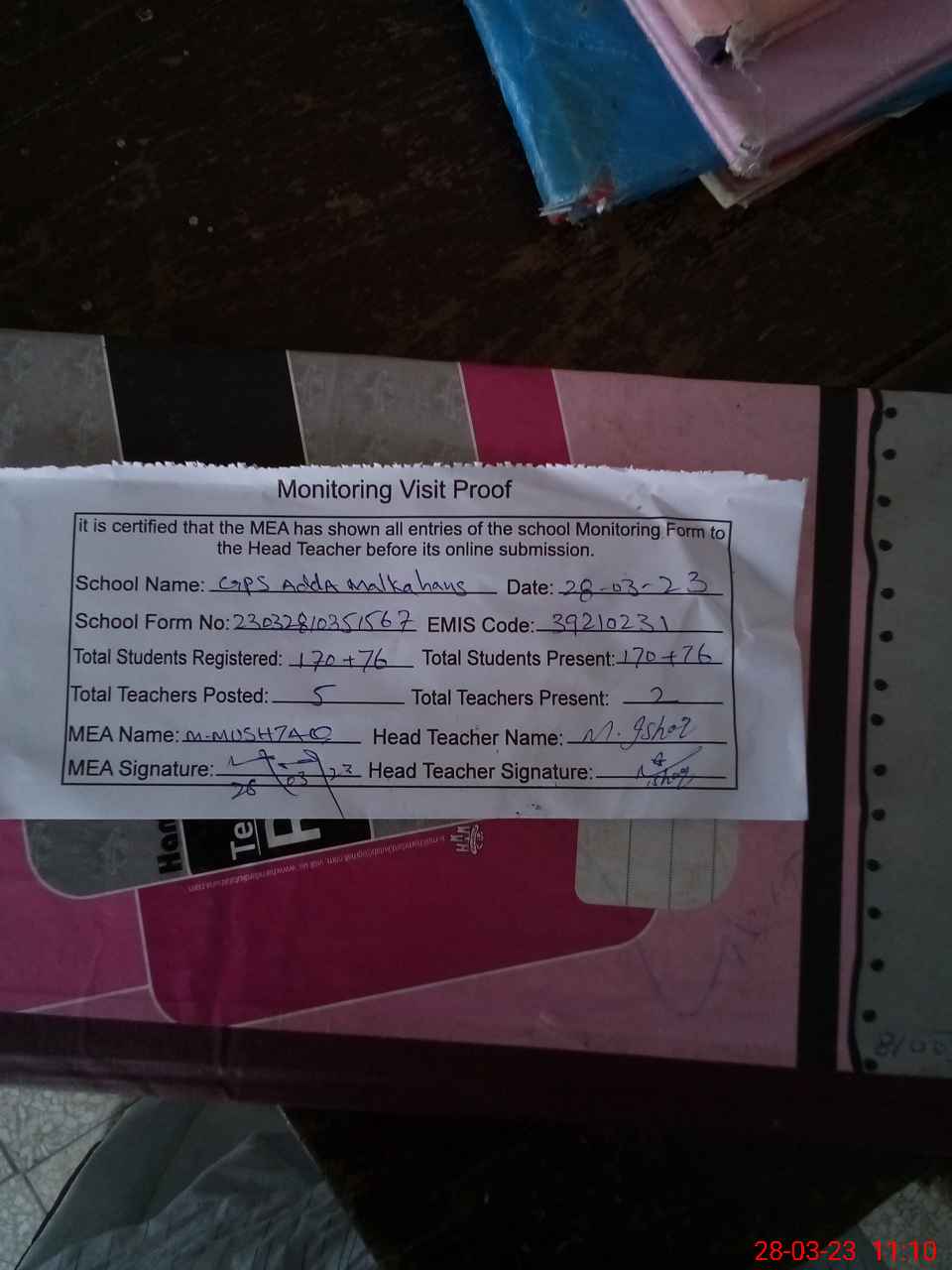 | Attendance Register | Head Teacher | MEA with School | Visit Proof |