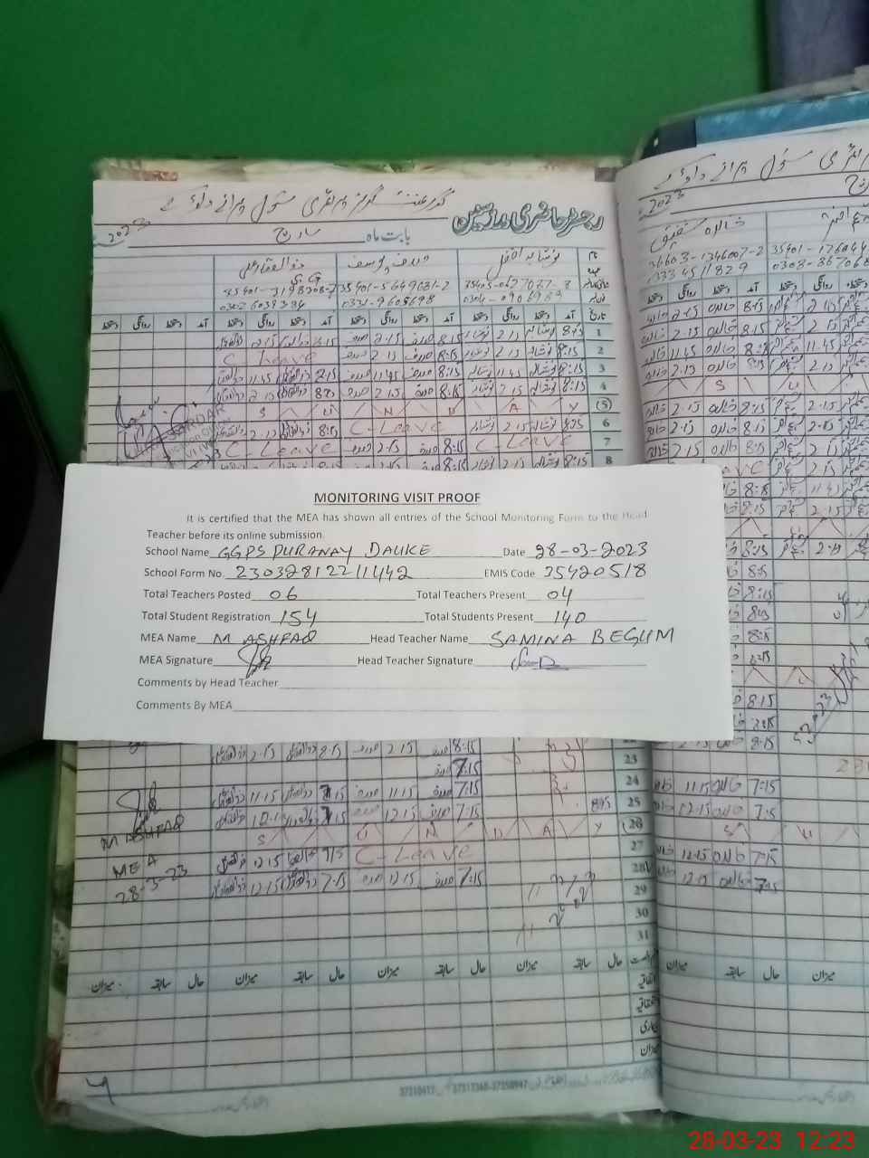 | Attendance Register | Head Teacher | MEA with School | Visit Proof |