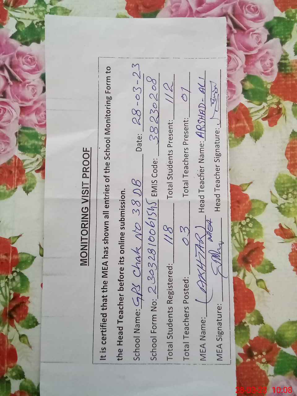 | Attendance Register | Head Teacher | MEA with School | Visit Proof |