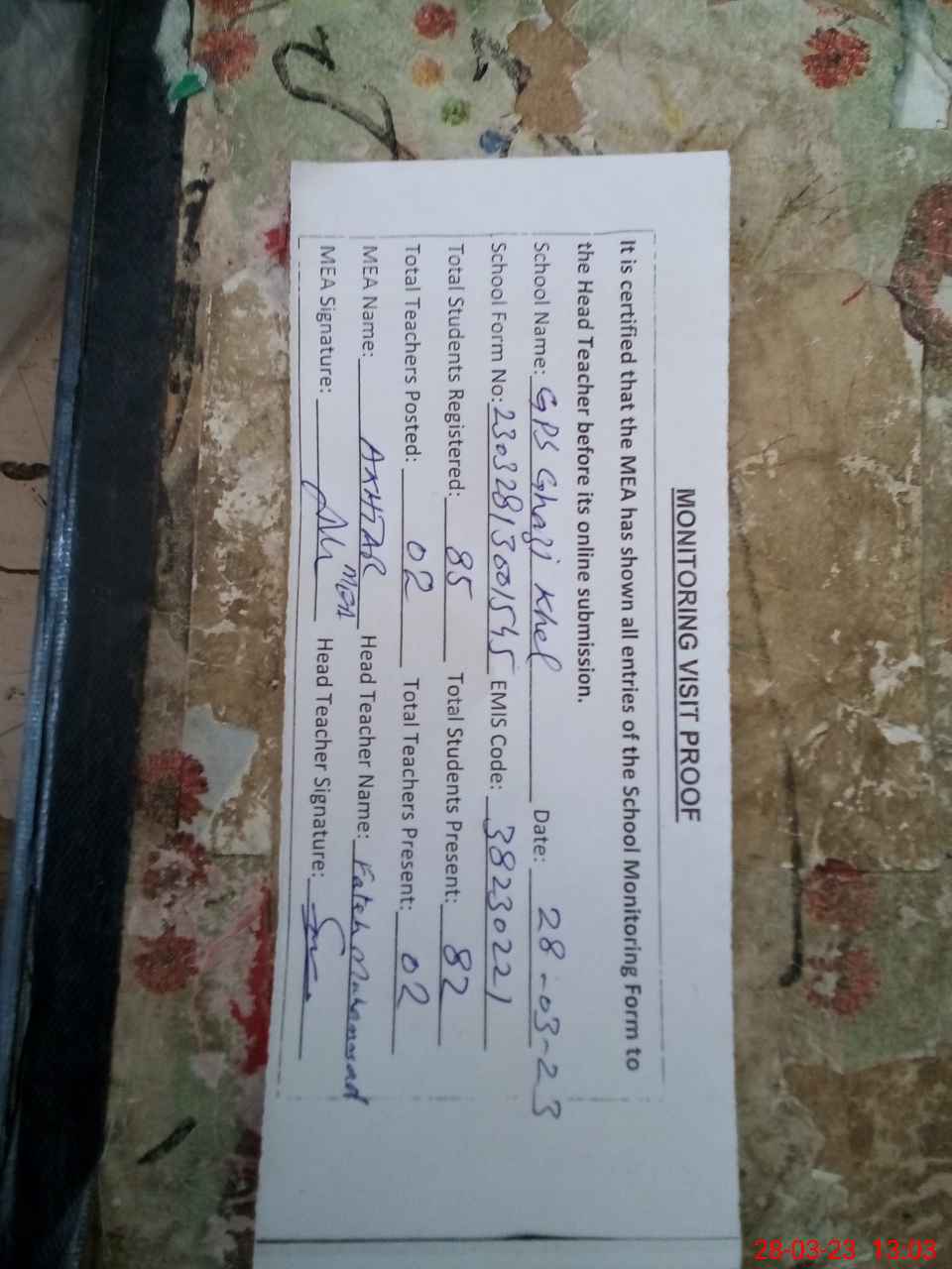 | Attendance Register | Head Teacher | MEA with School | Visit Proof |