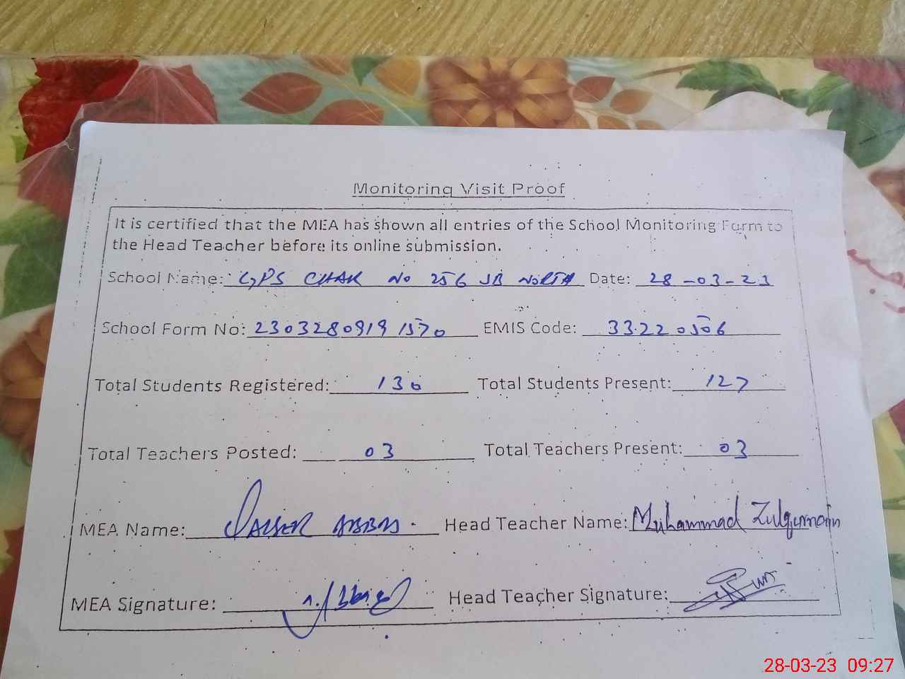 | Attendance Register | Head Teacher | MEA with School | Visit Proof |