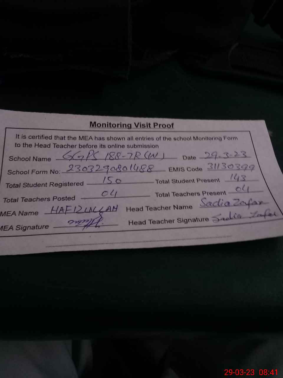 | Attendance Register | Head Teacher | MEA with School | Visit Proof |
