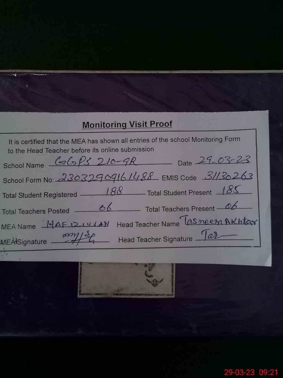 | Attendance Register | Head Teacher | MEA with School | Visit Proof |