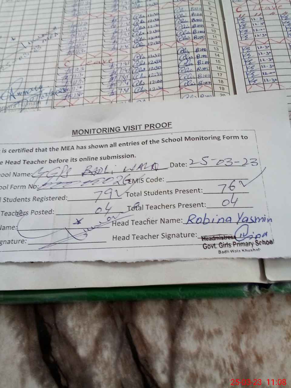 | Attendance Register | Head Teacher | MEA with School | Visit Proof |