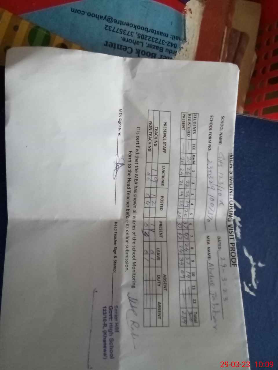 | Attendance Register | Head Teacher | MEA with School | Visit Proof |