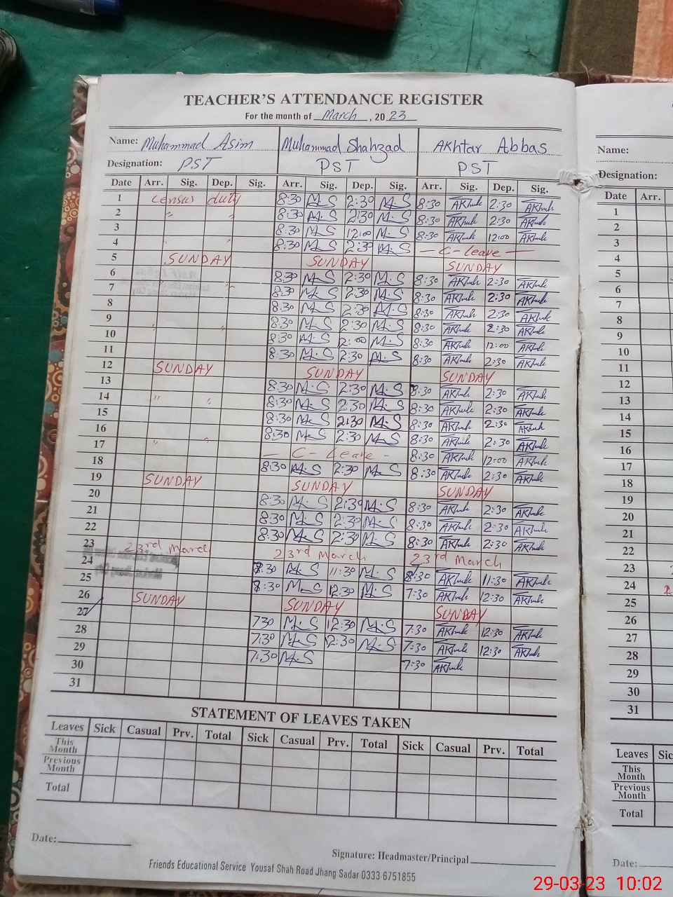 | Leave | Duty | Absent | Maternity | Medical | Ex- Pak |