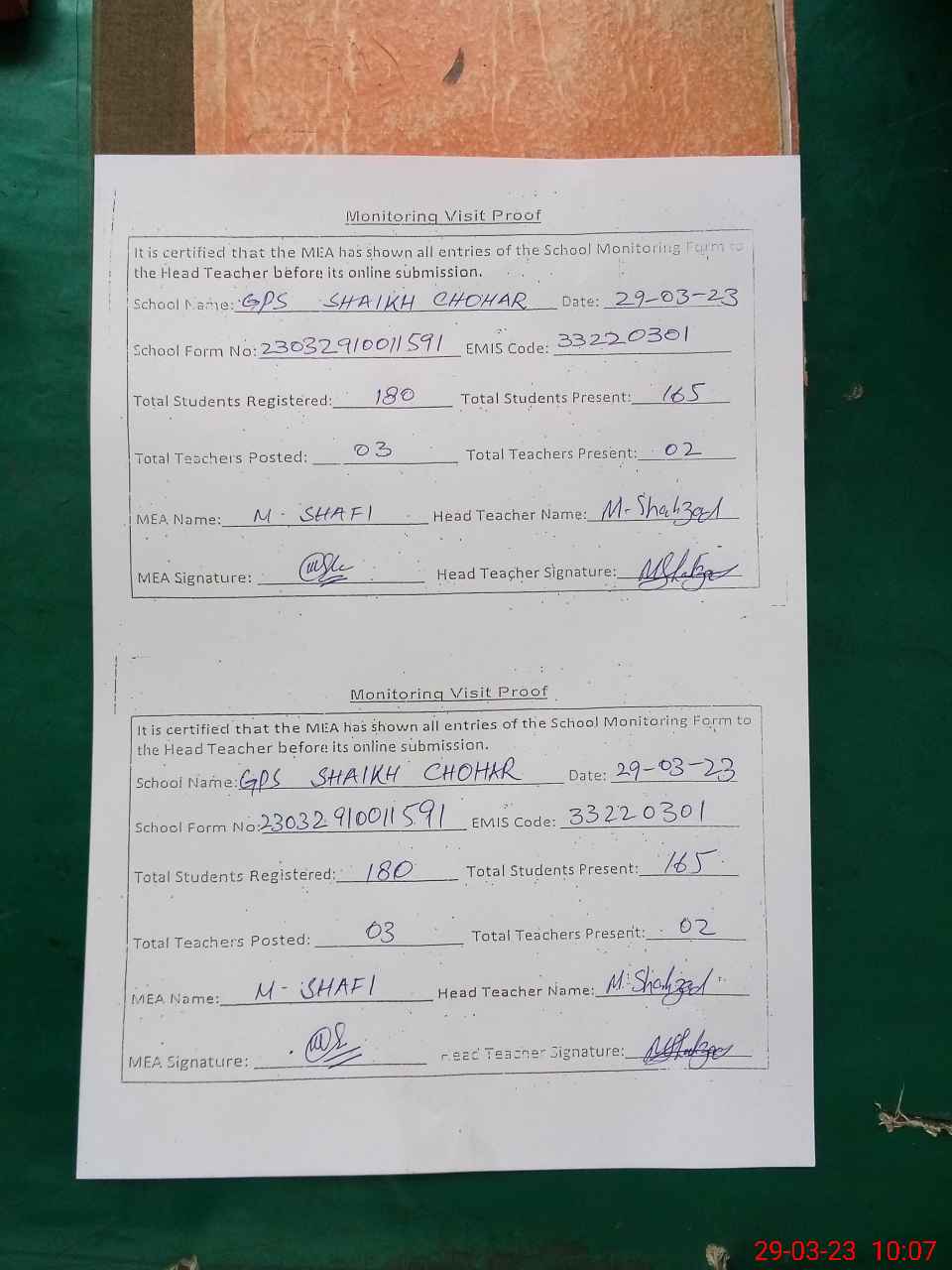 | Attendance Register | Head Teacher | MEA with School | Visit Proof |