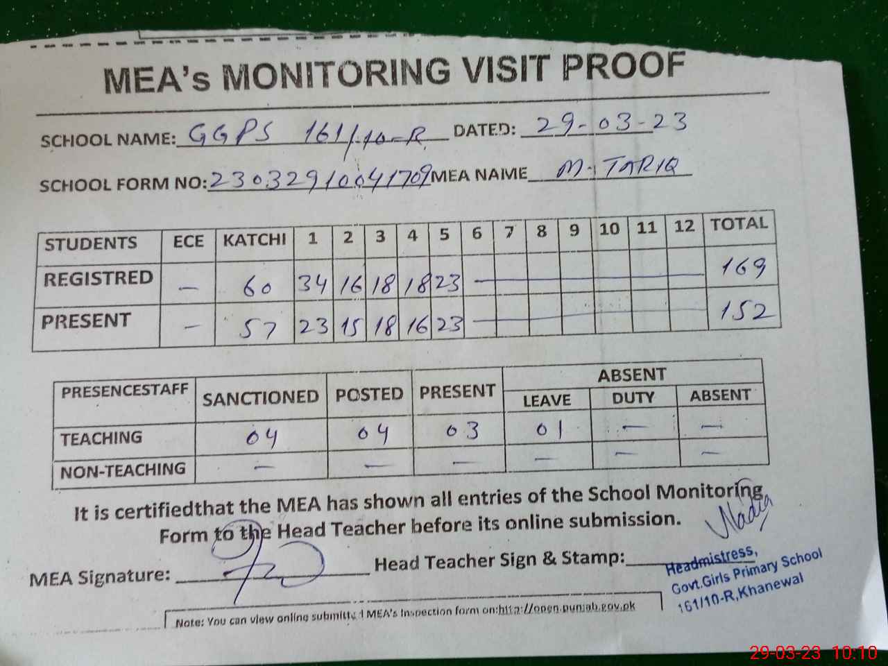 | Attendance Register | Head Teacher | MEA with School | Visit Proof |