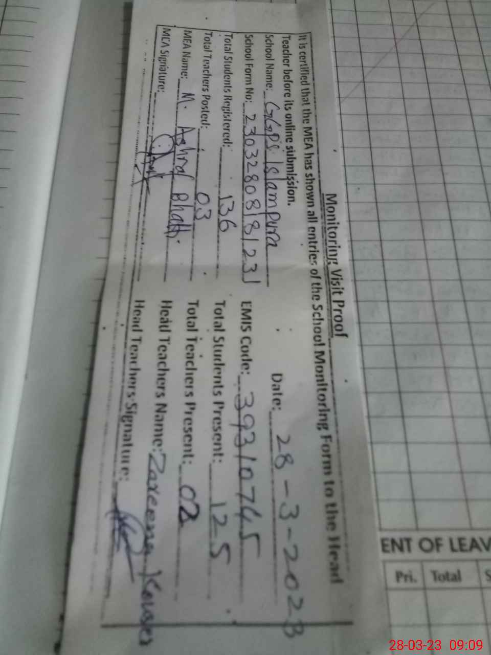 | Attendance Register | Head Teacher | MEA with School | Visit Proof |