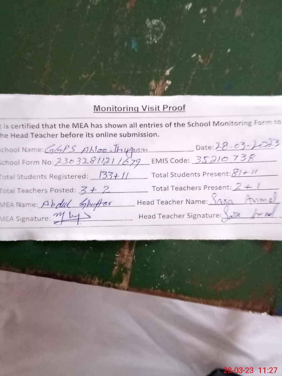 | Attendance Register | Head Teacher | MEA with School | Visit Proof |