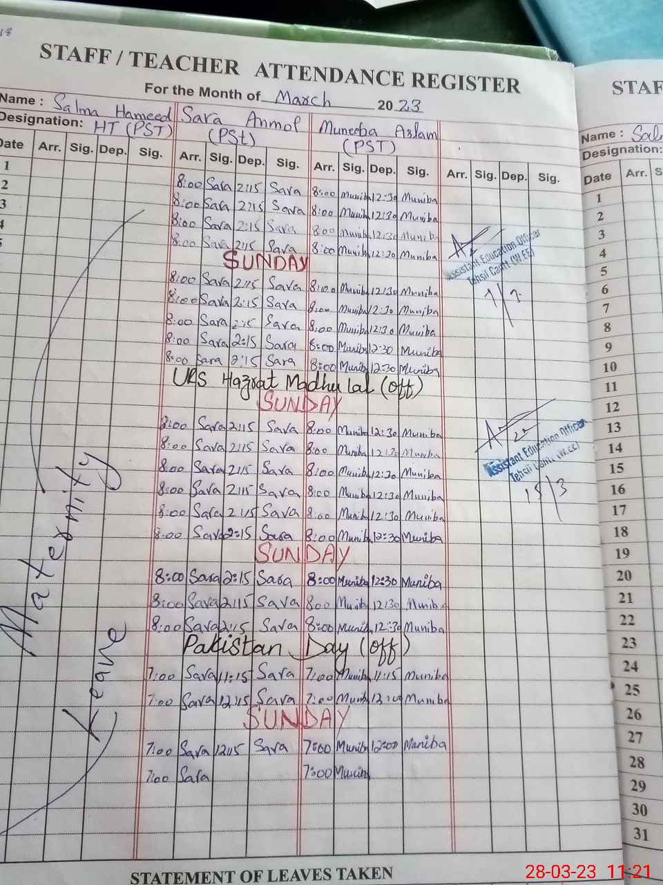 | 35**** | Sa**** Ha**** | PST | Regular | 28 | 0 | 0 | 28 | 0 | 0 | 0 | 0 | 0 | Maternity |