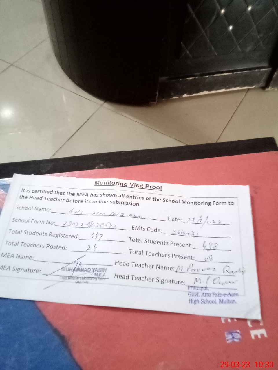 | Attendance Register | Head Teacher | MEA with School | Visit Proof |